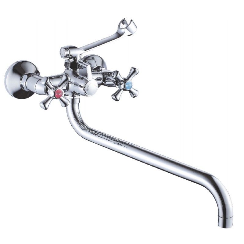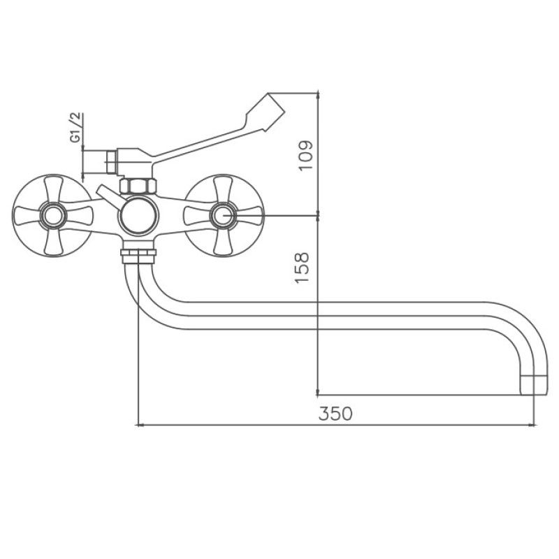 Смеситель изготовлен из металлического сплава. Переключатель потоков на корпусе смесителя. Держатель лейки на корпусе смесителя. Диаметр декоративных чашек 70 мм. Душевой гарнитур в комплекте. Межосевое расстояние (расстояние между выходом горячей и холодной трубы) 150 мм. Данное расстояние изменяется за счет входящих в комплект эксцентриков на 15 мм. в большую или меньшую стороны. Цвет хром