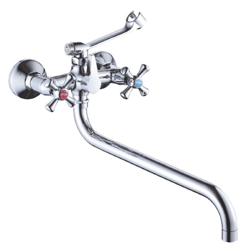 Смеситель изготовлен из металлического сплава. Переключатель потоков на корпусе смесителя. Держатель лейки на корпусе смесителя. Диаметр декоративных чашек 70 мм. Душевой гарнитур в комплекте. Межосевое расстояние (расстояние между выходом горячей и холодной трубы) 150 мм. Данное расстояние изменяется за счет входящих в комплект эксцентриков на 15 мм. в большую или меньшую стороны. Цвет хром