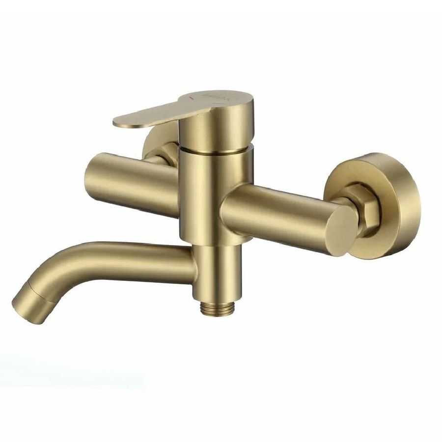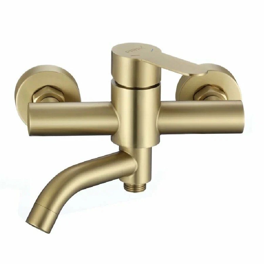 Смеситель для ванны Fmark FS8206С, матовое золото. Душевой гарнитур в комплекте. Керамический картридж. Подводка 1/2". Оснащение: аэратор, металлическая розетка, эксцентрики, душевой шланг, душевая лейка, держатель для душевой лейки. Материал лейки: abs-пластик. Диаметр лейки 12 см. Гарантия: 3 года.
