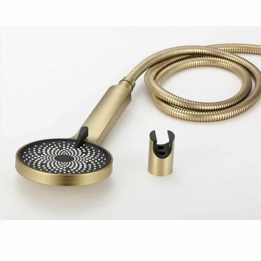 Смеситель для ванны Fmark FS8225С, матовое золото. Душевой гарнитур в комплекте. Керамический картридж. Подводка 1/2". Оснащение: аэратор, металлическая розетка, эксцентрики, душевой шланг, душевая лейка, держатель для душевой лейки. Материал лейки: ABS-пластик. Диаметр лейки 9,8 см. Гарантия: 3 года.