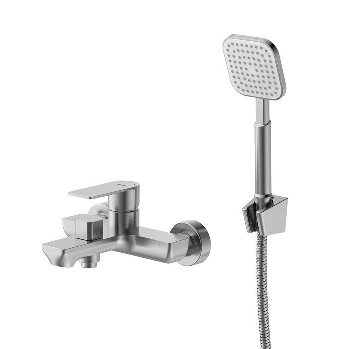 • Душевая лейка с держателем, ПВХ-шланг (1,5 м) и крепеж идут в комплекте. Поворотный дивертор работает при любом давлении воды, переключая поток воды с излива на квадратную душевую лейку.