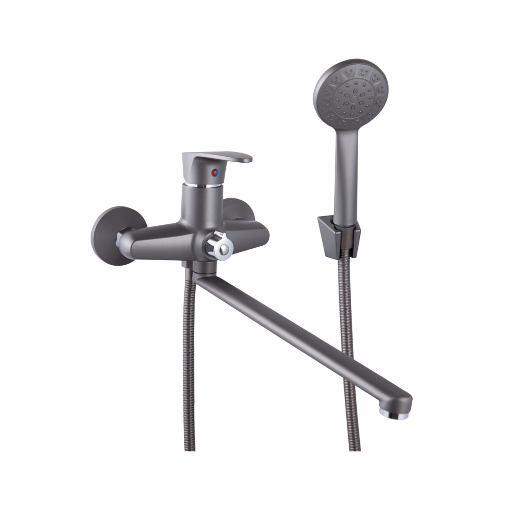 Смеситель для ванны PLstart PL2205-17, графит. Материал: пластик/сталь. Вращение излива: поворотный. Управление: рычажное. Душевой гарнитур в комплекте: да.