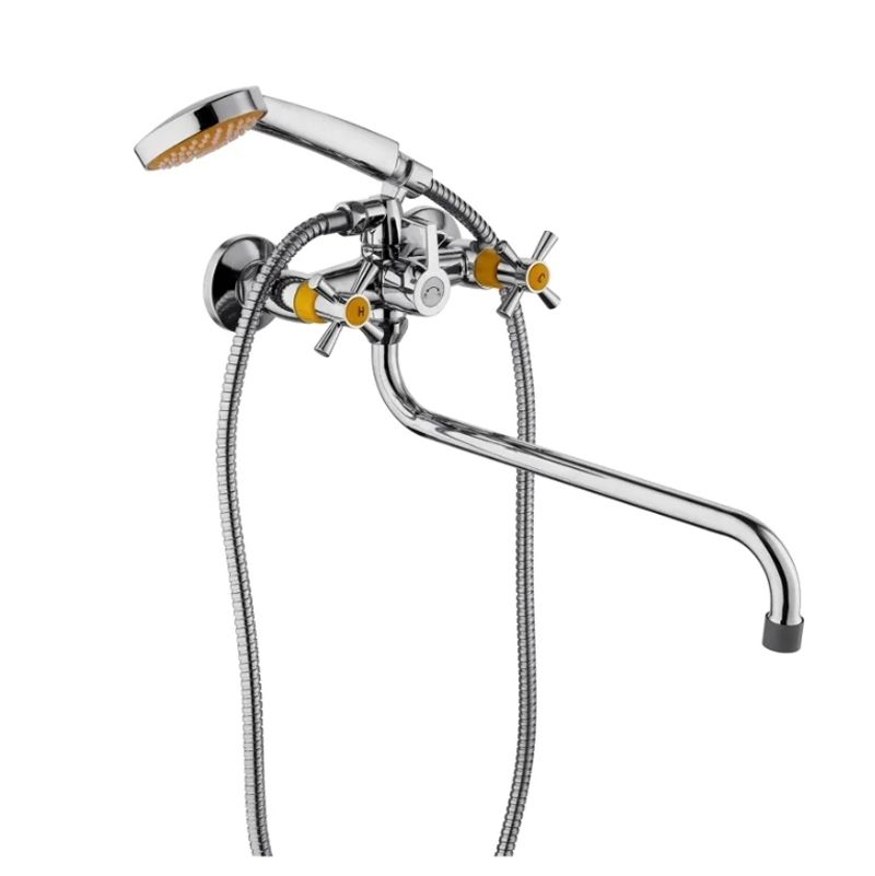 Смеситель для ванны PLstart PL2218-9, хром/желтый. Материал: пластик/сталь. Вращение излива: поворотный. Управление: вентильное. Душевой гарнитур в комплекте: да.