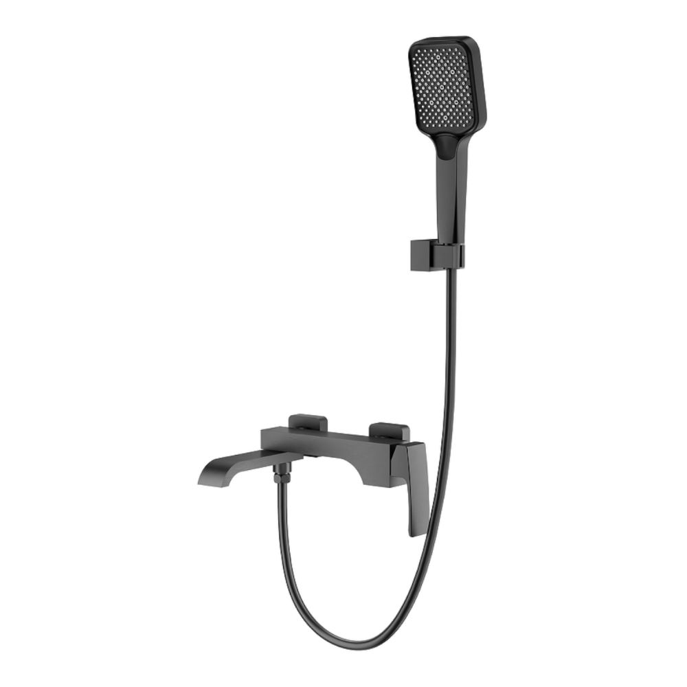 Смеситель для ванны Raglo R02.30.09. Цвет: графит. Материал: латунь. Управление: однорычажное. Механизм: керамический картридж. Излив: поворотный. Тип излива: каскадный. Количество режимов струи ручного душа: 3. Отверстия для монтажа: 2. Монтаж: на стену.