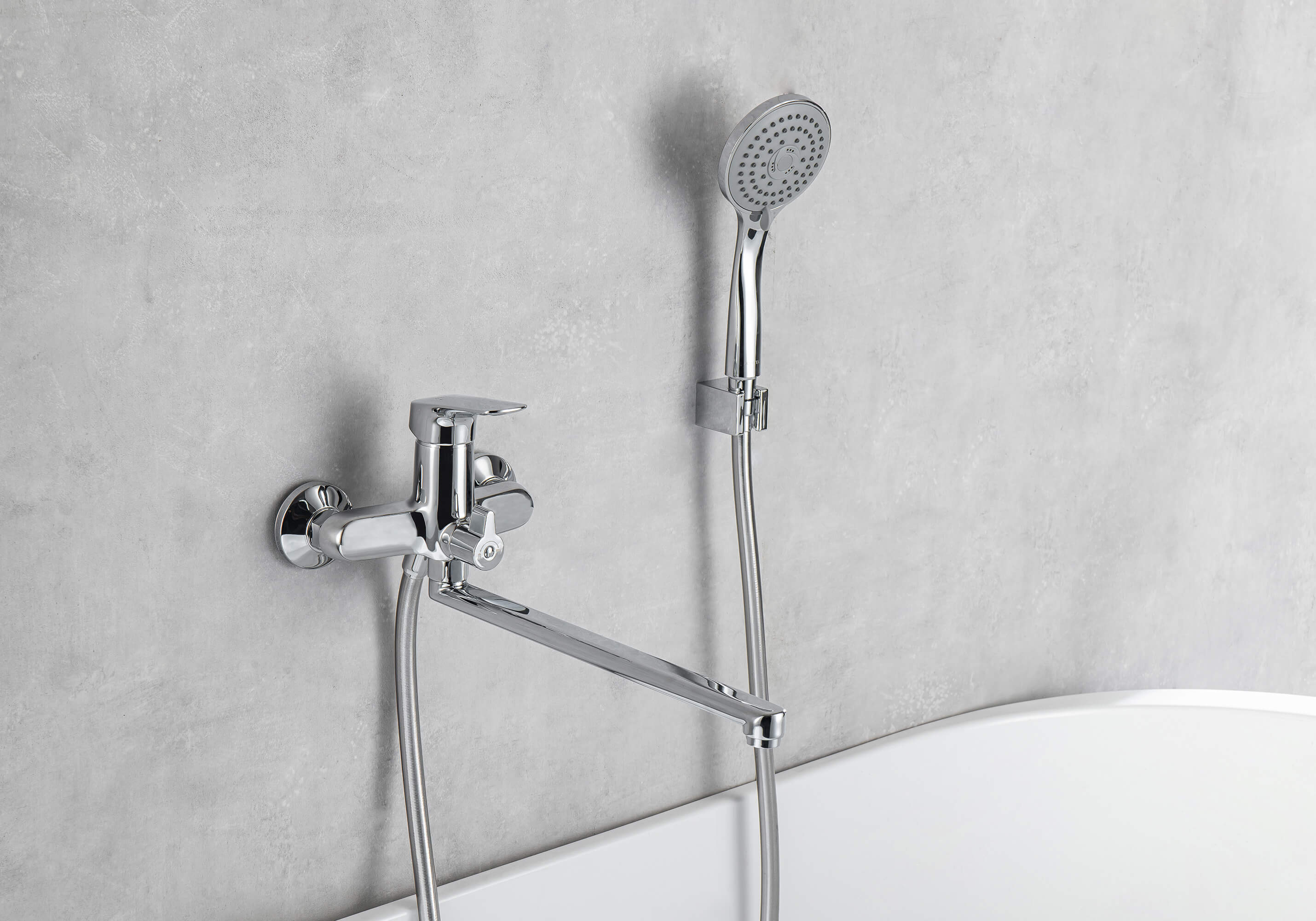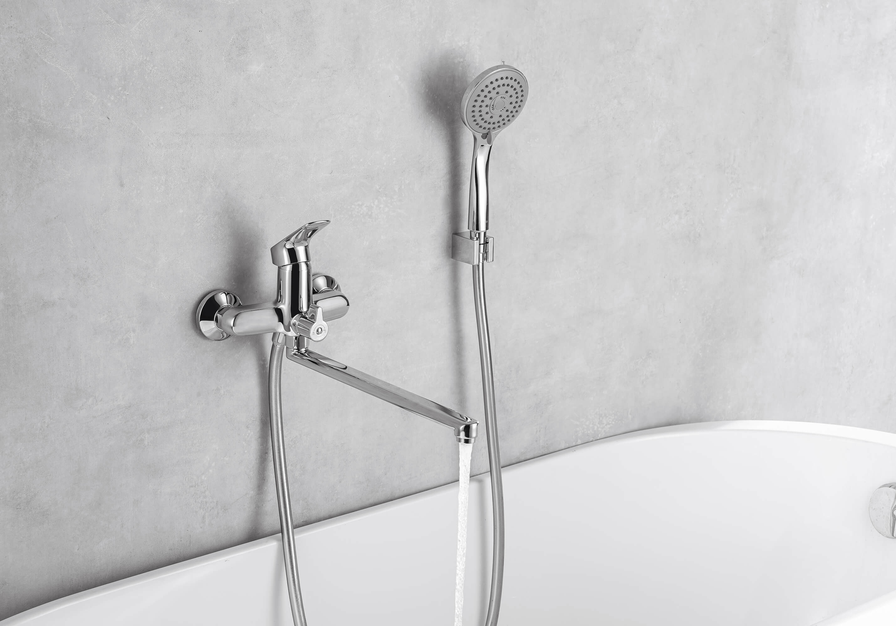 благодаря длинному изливу, возможность использоватьодновременно для ванны и раковины; однорычажная система регулировки силы струи и температуры воды; цельный корпус смесителя снижает вероятность протечек; поворотный переключатель на душ; лейка и шланг в комплект не входят;