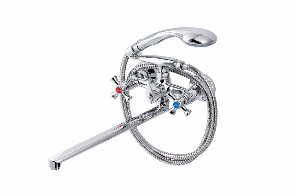 Смеситель, эксцентрики-2шт., декоративная шайба (отражатель)-2шт., шланг душевой, лейка душевая, держатель душевой лейки, паспорт. |