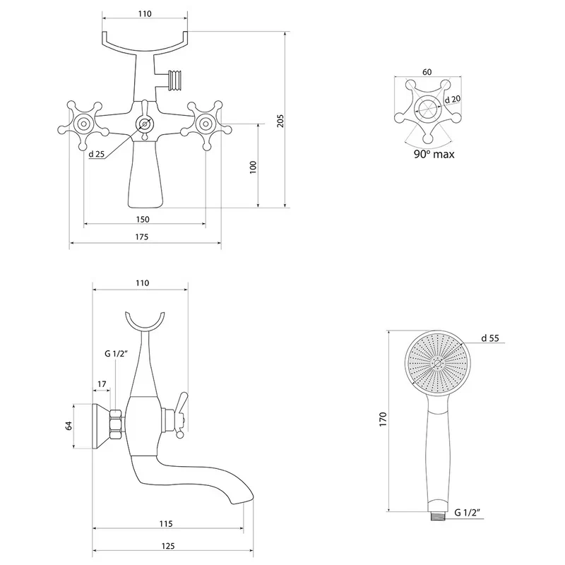 Смеситель, шланг, душевая лейка, эксцентрики, декоративные отражатели |