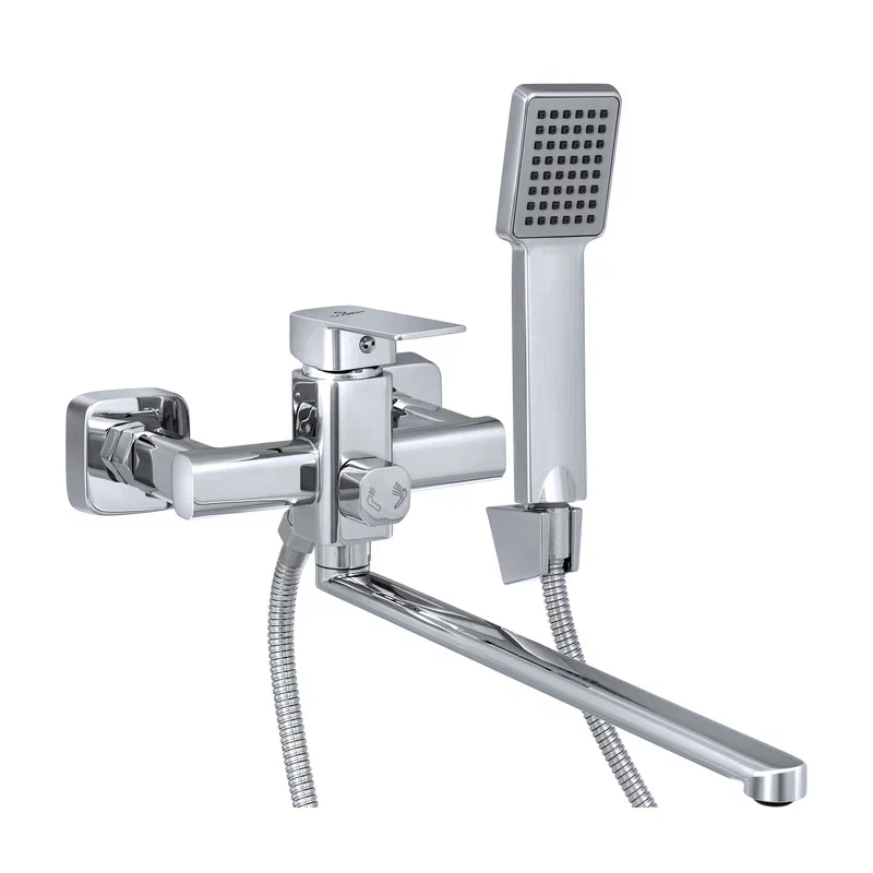 Современный однорычажный смеситель для ванны с длинным поворотным изливом от компании «СЛАВЕН» c собственной сборочной линией полного цикла в Подмосковье.