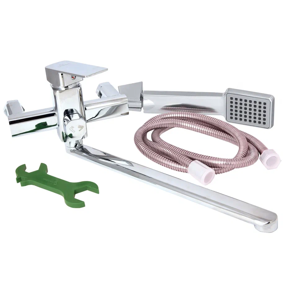 Комплектуется душевым шлангом в металлической оплетке с однорежимной лейкой, паспортом изделия с гарантийным талоном, универсальным гаечным ключом.