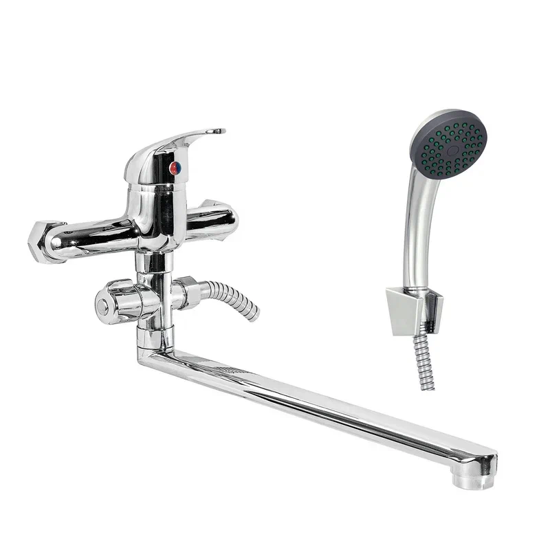 Современный однорычажный смеситель для ванны с длинным поворотным изливом от компании «СЛАВЕН» c собственной сборочной линией полного цикла в Подмосковье.