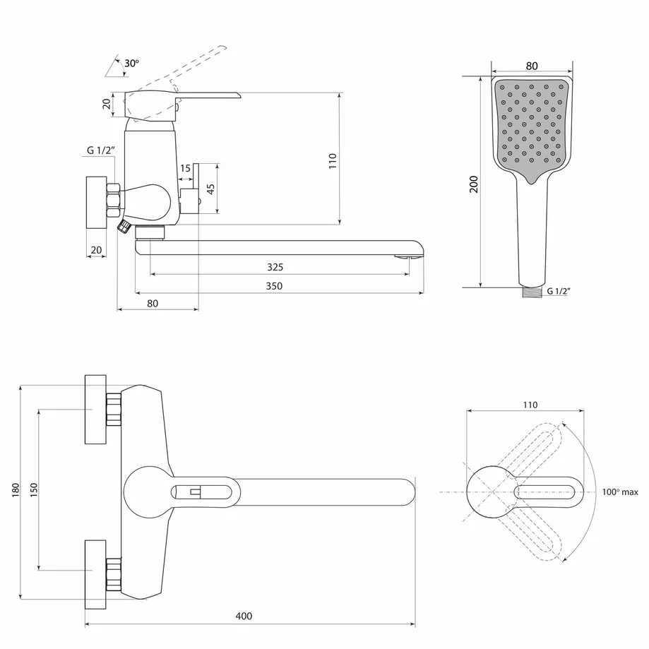 Смеситель, шланг, душевая лейка, держатель душевой лейки, эксцентрики, декоративные отражатели |