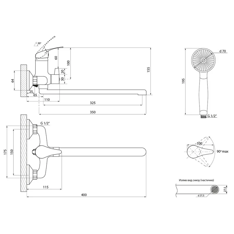 Тип крепления лейки: Крепление вертикальное, настенное;