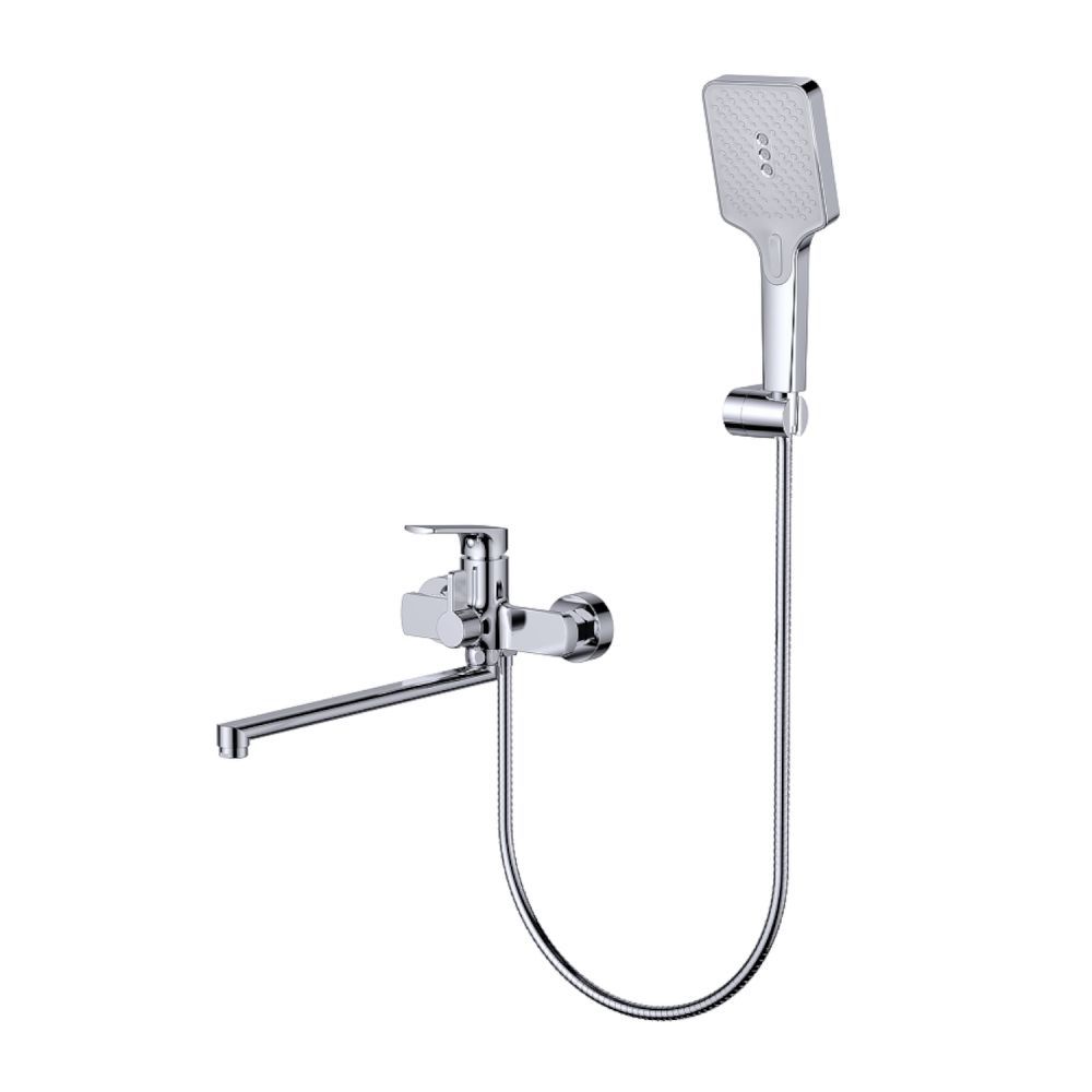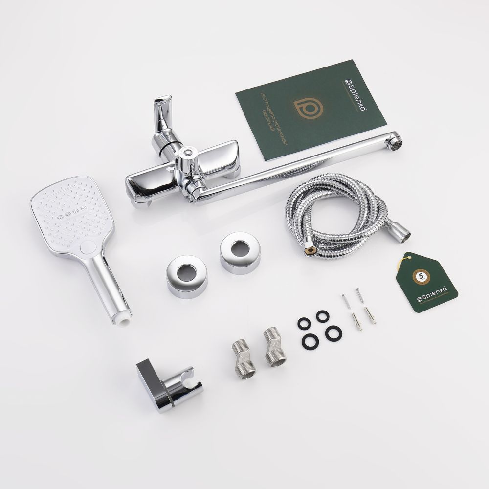 Смеситель для ванны Splenka S30.22 универсальный. Цвет: хром. Материал: латунь. Управление: однорычажное. Механизм: керамический картридж. Излив: поворотный. Стандарт подводки: G 1/2. Аэратор. Переключатель ванна/душ. Монтаж: на стену. Душевая лейка - 3 режима.