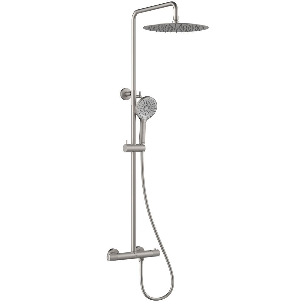 Корпус смесителя с термостатическим картриджем, 3-позиционным картриджным переключателем с керамическими пластинами и металлическими рукоятками, стойка для душа, держатель душевой лейки, 3-функциональная душевая лейка, душевой шланг 1,5 м, присоединительная группа для настенного крепления |