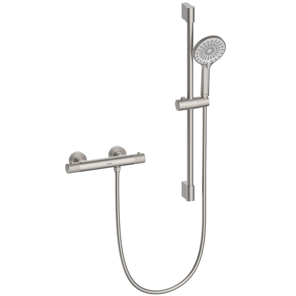 Корпус смесителя с термостатическим картриджем, кранбуксой с керамическими пластинами и металлическими рукоятками, стойка для душа, держатель душевой лейки, лейка верхнего душа "Тропический дождь", 3-функциональная душевая лейка, душевой шланг 1,5 м, присоединительная группа для настенного крепления |