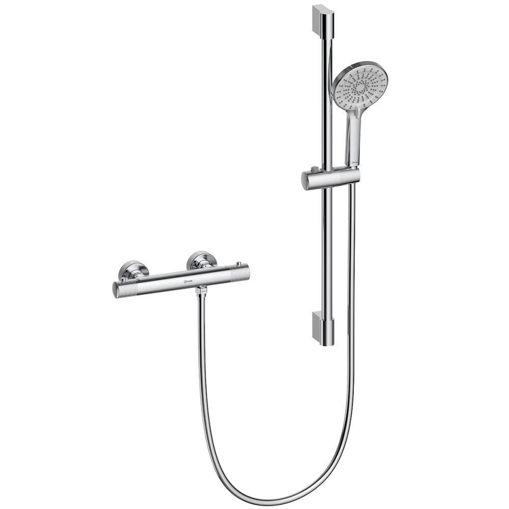 Корпус смесителя с термостатическим картриджем, кранбуксой с керамическими пластинами и металлическими рукоятками, стойка для душа, держатель душевой лейки, лейка верхнего душа "Тропический дождь", 3-функциональная душевая лейка, душевой шланг 1,5 м, присоединительная группа для настенного крепления |