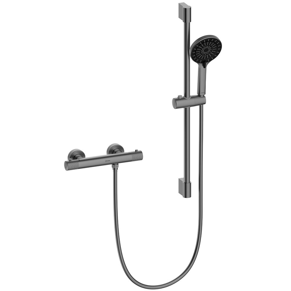 Корпус смесителя с термостатическим картриджем, кранбуксой с керамическими пластинами и металлическими рукоятками, стойка для душа, держатель душевой лейки, лейка верхнего душа "Тропический дождь", 3-функциональная душевая лейка, душевой шланг 1,5 м, присоединительная группа для настенного крепления |