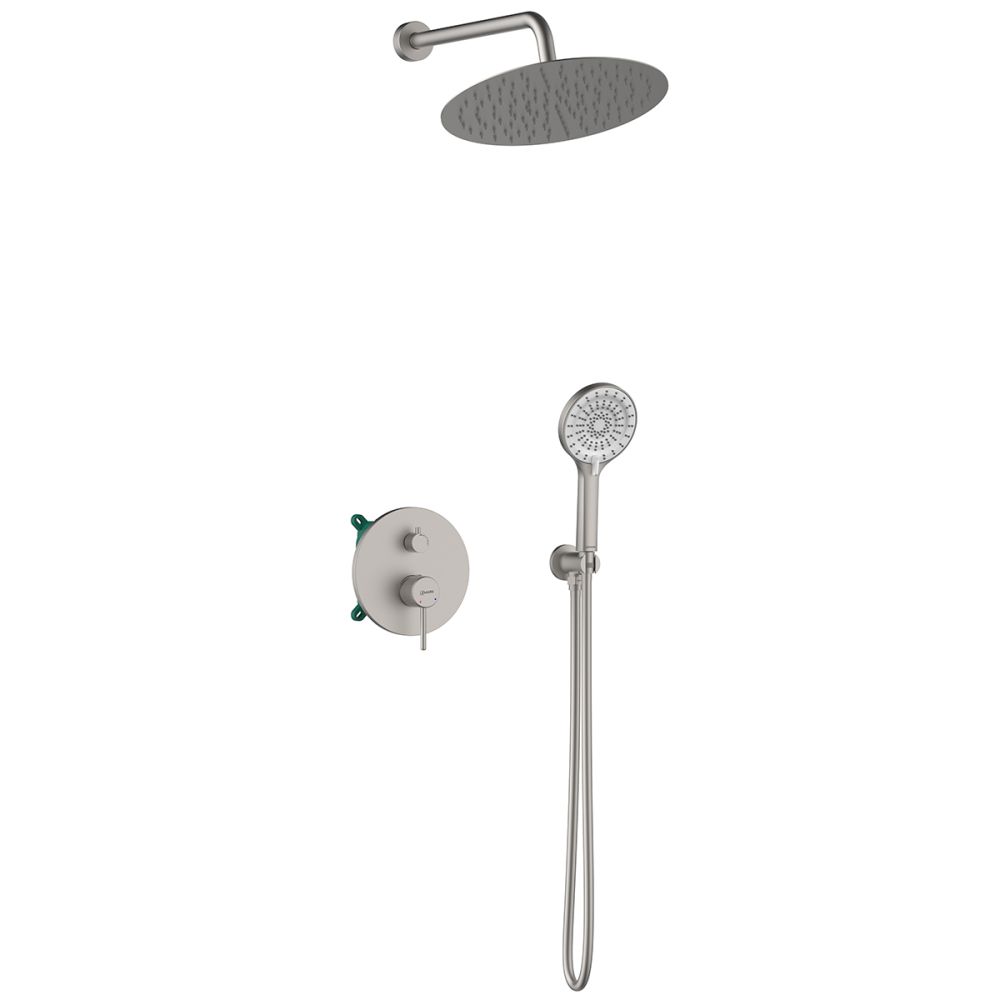 Корпус смесителя с картриджем с керамическими пластинами и переключателем-дивертором с керамическими пластинами, рукоятка картриджа, рукоятка переключателя-дивертора, держатель лейки верхнего душа, лейка верхнего душа "Тропический дождь", 3-функциональная душевая лейка, душевой шланг 1,5 м, присоединительная группа для настенного крепления |