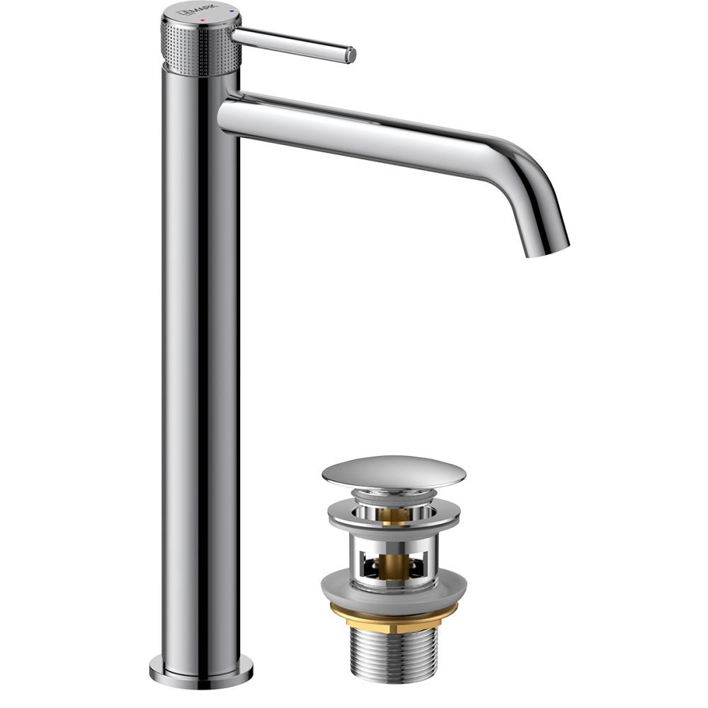 Корпус смесителя с монолитным изливом с аэратором, картриджем с керамическими пластинами и металлической рукояткой, Гибкая подводка для воды ½"-(2 шт.), Корпус донного клапана, присоединительная группа для настольного крепления |