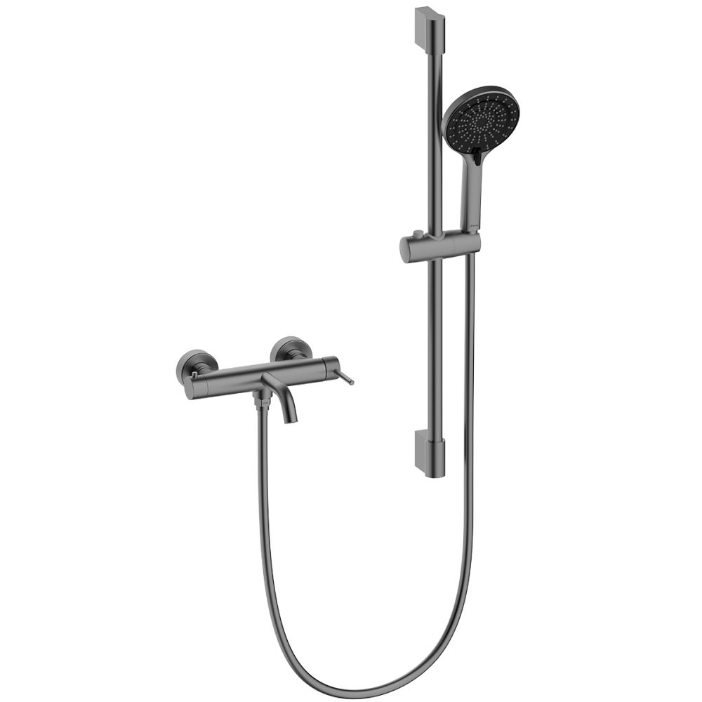 Корпус смесителя с монолитным изливом с аэратором, картриджем с керамическими пластинами, 2-позиционным картриджным переключателем с керамическими пластинами и металлической рукояткой, стойка для душа, держатель душевой лейки, 3-функциональная душевая лейка, душевой шланг 1,5 м, присоединительная группа для настенного крепления |