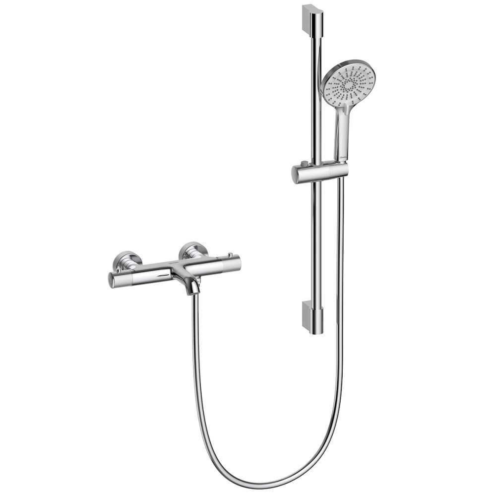 Корпус смесителя с монолитным изливом с аэратором, термостатическим картриджем, 3-позиционным картриджным переключателем с керамическими пластинами и металлическими рукоятками, стойка для душа, держатель душевой лейки, 3-функциональная душевая лейка, душевой шланг 1,5 м, присоединительная группа для настенного крепления |