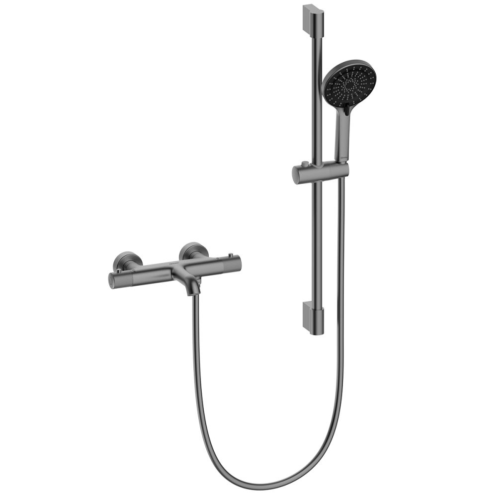 Корпус смесителя с монолитным изливом с аэратором, термостатическим картриджем, 3-позиционным картриджным переключателем с керамическими пластинами и металлическими рукоятками, стойка для душа, держатель душевой лейки, 3-функциональная душевая лейка, душевой шланг 1,5 м, присоединительная группа для настенного крепления |