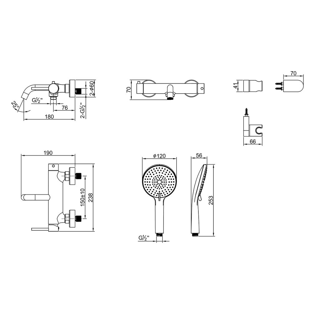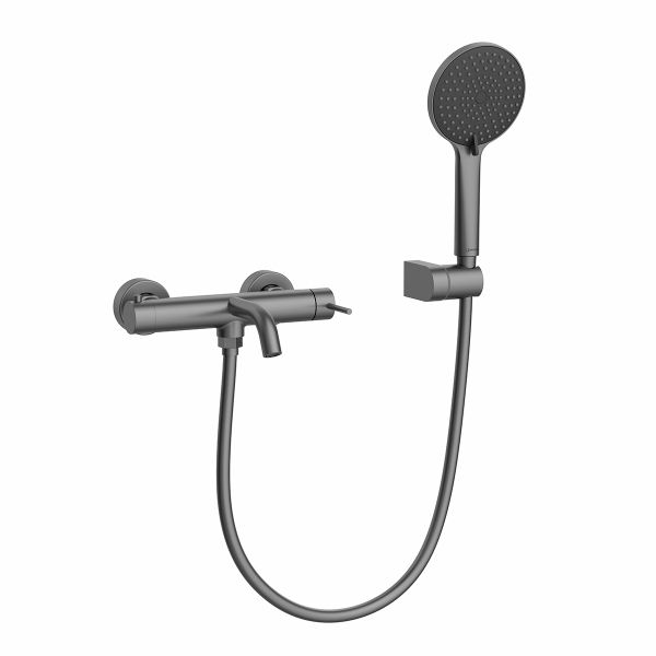 Корпус смесителя с монолитным изливом с аэратором, картриджем с керамическими пластинами, 2-функционильным картриджным пластинами и металлическими рукоятками; Прокладка ¾" (2 шт.); Декоративный отражатель (2 шт.) Эксцентриковый переходник G½" (2 шт.); Держатель душевой лейки; Колпачок; Дюбель (2 шт.); Шуруп (2 шт.); 3-функциональная душевая лейка; Душевой шланг 1,5 м (ПВХ) в комплекте с прокладками ½" (2 шт.); Ключ для аэратора |