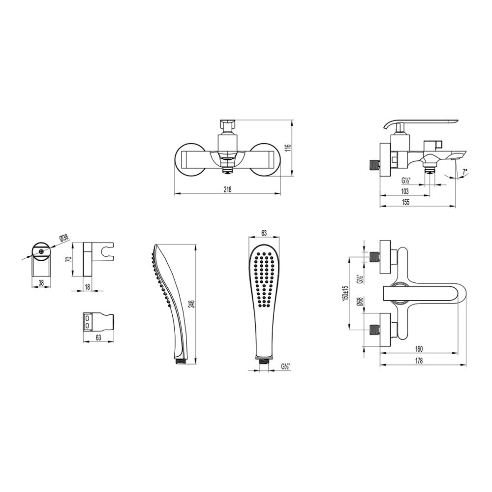 - Аксессуары в комплекте: душевой шланг ПВХ 1,5 м, 1-функциональная лейка 62х249 мм, настенное поворотное крепление