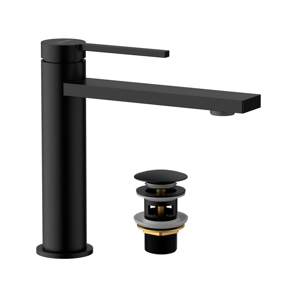 Корпус смесителя с монолитным изливом с аэратором, картриджем с керамическими пластинами и металлической рукояткой, Гибкая подводка для воды ½"-(2 шт.), Корпус донного клапана, присоединительная группа для настольного крепления |