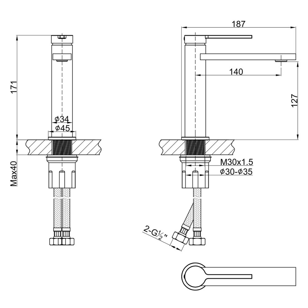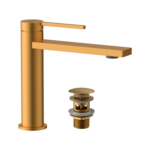 Корпус смесителя с монолитным изливом с аэратором, картриджем с керамическими пластинами и металлической рукояткой, Гибкая подводка для воды ½"-(2 шт.), Корпус донного клапана, присоединительная группа для настольного крепления |