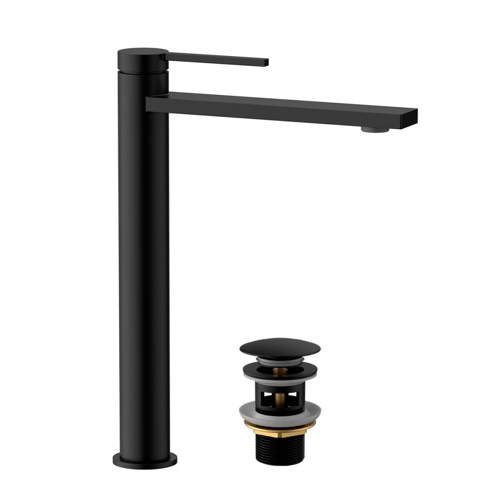 Корпус смесителя с монолитным изливом с аэратором, картриджем с керамическими пластинами и металлической рукояткой, Гибкая подводка для воды ½"-(2 шт.), Корпус донного клапана, присоединительная группа для настольного крепления |
