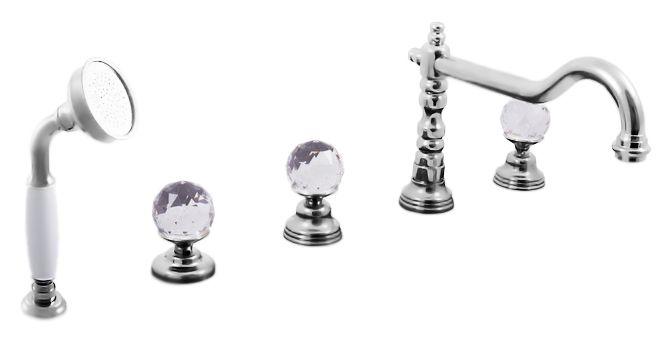 Смеситель на борт ванны Rav Slezak Brilliance164.5P монолитный, с душевым гарнитуром, изготовлен из высококачественной латуни, которая исключает какую-либо коррозию. Латунные рукоятки c граненым хрусталем от чешского производителя Preciosa Bohemie Glass. Качественные керамические кран буксы, гарантируют долговечность и мягкий поток воды, производство Германия. Керамический переключатель душ/излив. Шланг с пружиной, которая обеспечивает его лёгкое возвращение в держатель. Длина шланга 2000 мм. Латунная душевая лейка с керамической ручкой. В комплекте смеситель, шланг, душевая лейка и комплект крепления.