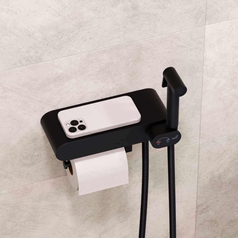 Смеситель гигиенический настенный - RGW SP-222B, с полочкой с держателем туалетной бумаги или полотенца, черный