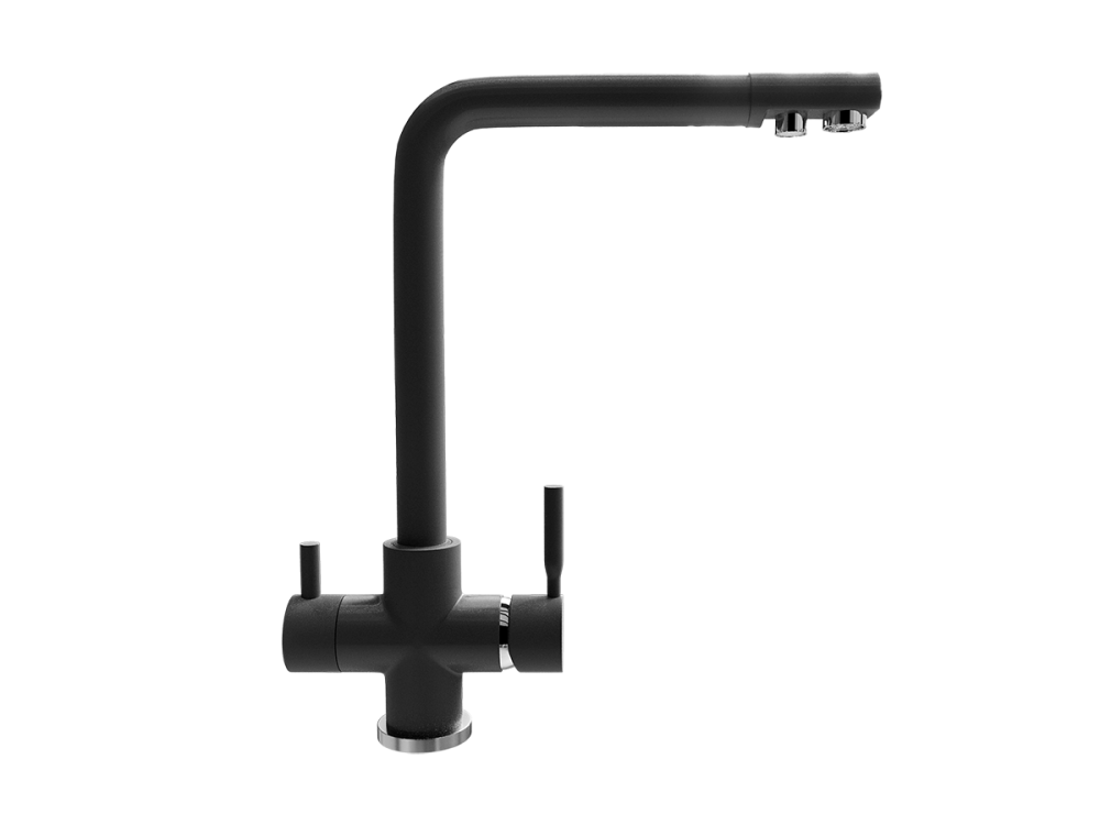 В смесителе реализован тройной подвод воды через один излив: холодная, горячая и фильтрованная. Переход с одного подвода на другой производится поворотом рычага. Набор для соединения с фильтром входит в комплект (сам фильтр приобретается дополнительно). В качестве керамического картриджа используется известный бренд Wanhai диаметром 35 мм с высокой пропускной способностью в 500 тысяч циклов "открывания-закрывания". На подвижные части картриджа Wanhai нанесена специальная невымываемая силиконовая смазка, а керамические пластины изготовлены из 96% оксида алюминия, что, в сочетании с высоким качеством шлифовки обеспечивает долговечность, надежность, плавность хода рукоятки. Для экономии воды смеситель оборудован передовым самопромывным силиконовым аэратором Neoperl, который защищает от известкового налета, обеспечивает долгий срок службы смесителя и обладает функцией легкой очистки. Поворотный излив гусака вращается на 360 градусов. Отличительной особеностью смесителя является ограниченный ход ручек (рычагов) управления обычной и фильтрованной воды, что позволяет расположить смеситель вплотную к стене. В комплектацию входят: керамический картридж Wanhai, гибкая подводка, комплект крепежных элементов, кран-букса с керамическими пластинами для дополнительного излива для фильтрованной воды, набор для подсоединения фильтра питьевой воды (гибкая подводка + переходник-цанга), технический паспорт и гарантийный талон. Заводская гарантия составляет 3 года на материал корпуса, 1 год на комплектующие к смесителю и 1 год на материал покрытия.