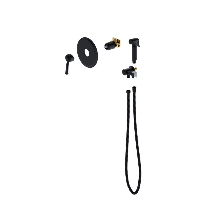 Смеситель скрытого монтажа - 1 шт. Декоративная накладка смесителя (латунная) - 1 шт. Шланг душа 1,2 м - 1 шт. Гигиеническая лейка (латунная) - 1 шт. Отвод из стены - держатель лейки (латунный) - 1 шт. Ручка управления смесителем - 1 шт. Инструкция - 1 шт. |