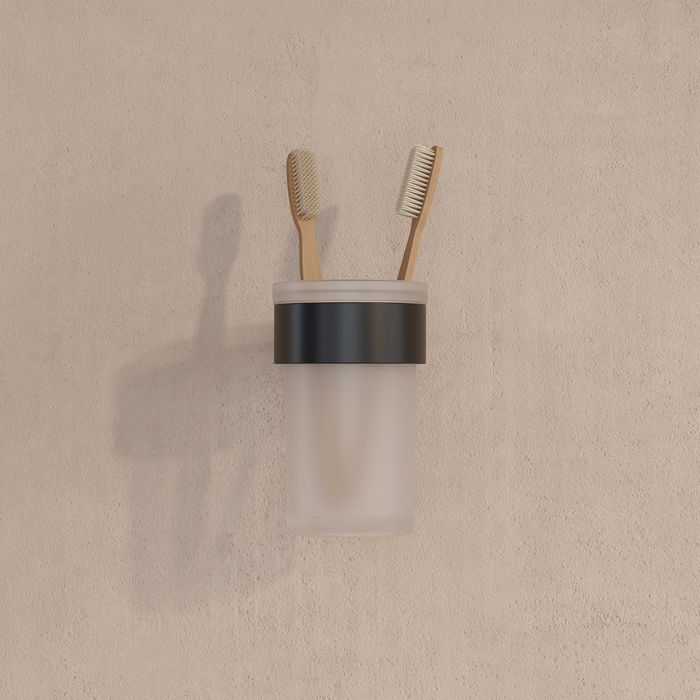 Стильный стакан Petite из матового белого стекла в держателе чёрного матового цвета.