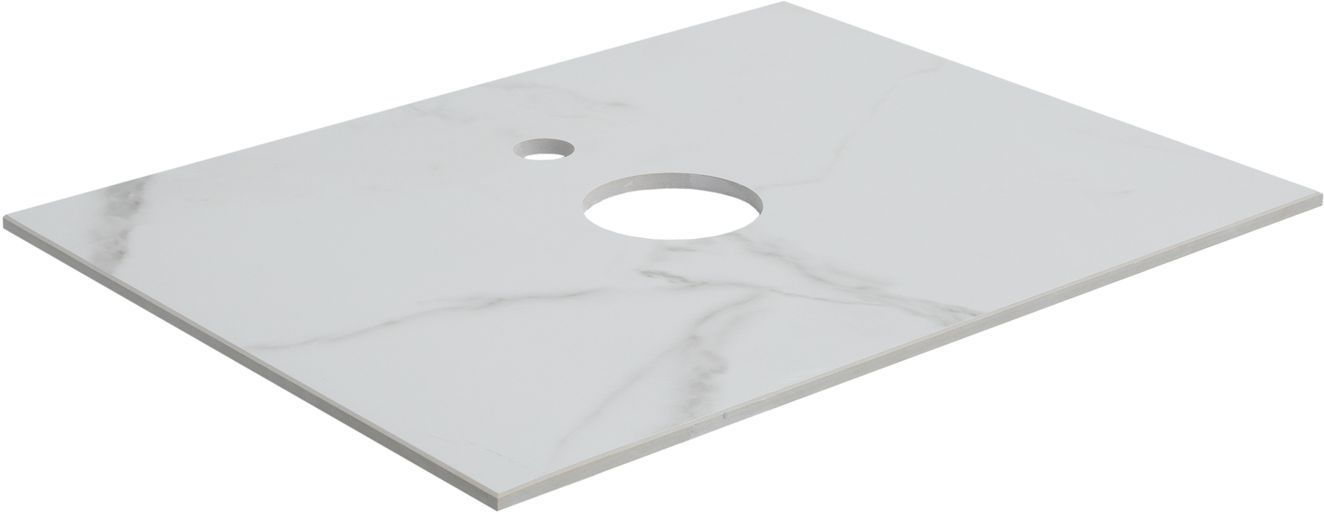 Столешница из керамогранита в цвете "белый мрамор с серыми прожилками" толщиной 10 мм предназначена для установки сверху на тумбу Nova Lite шириной 60 см. Керамогранит прекрасно подходит для помещений с повышенной влажностью. Это влагостойкий материал высокой плотности, благодаря чему ему не страшны агрессивные вещества. Он обладает также исключительной твердостью, что делает его стойким к истиранию. В столешнице предусмотрено отверстие для установки накладной раковины и вывода шлангов подводки воды. При установке смесителя на столешницу отверстие необходимо будет сделать самостоятельно в том месте, в котором удобно.