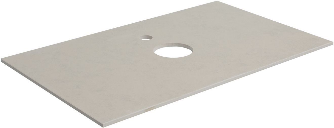 Столешница из керамогранита бежевого цвета толщиной 10 мм предназначена для установки сверху на тумбу. Керамогранит прекрасно подходит для помещений с повышенной влажностью. Это влагостойкий материал высокой плотности, благодаря чему ему не страшны агрессивные вещества. Он обладает также исключительной твердостью, что делает его стойким к истиранию. В столешнице предусмотрено отверстие для установки накладной раковины и вывода шлангов подводки воды. При установке смесителя на столешницу отверстие необходимо будет сделать самостоятельно в том месте, в котором удобно.