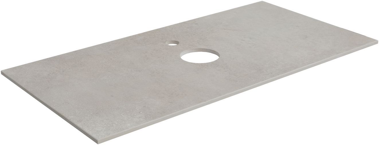 Столешница из керамогранита в сером цвете "под бетон" толщиной 10 мм предназначена для установки сверху на тумбу Nova Lite шириной 90 см. Керамогранит прекрасно подходит для помещений с повышенной влажностью. Это влагостойкий материал высокой плотности, благодаря чему ему не страшны агрессивные вещества. Он обладает также исключительной твердостью, что делает его стойким к истиранию. В столешнице предусмотрено отверстие для установки накладной раковины и вывода шлангов подводки воды. При установке смесителя на столешницу отверстие необходимо будет сделать самостоятельно в том месте, в котором удобно.