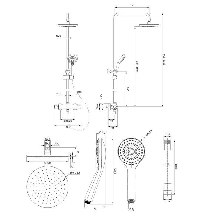 - верхний душ латунный (WG125GL), размер: ø25 см, отдаленность от стены: 43 см;