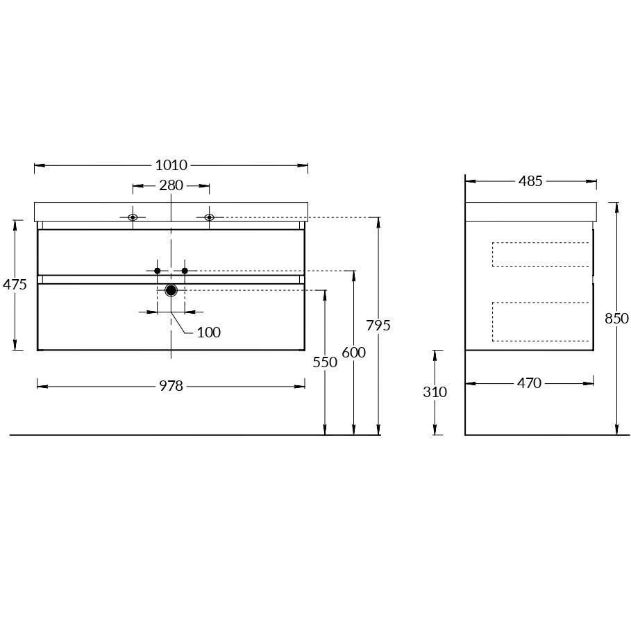 Тумба CUBO продолжает стиль раковины в геометричных деталях корпуса: два больших ящика удобно открывать благодаря торцу, скошенному по 45°