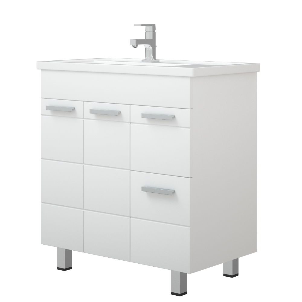 Коллекция "Денвер" - это вдохновление четкостью линий модернизма! Линейка выполнена из влагостойкого МДФ, покрытого белой глянцевой пленкой. Мебель комплектуется фурнитурой высокого качества, дверными петлями со встроенными доводчиками и удобными наклонными ручками. Линейная фрезеровка на фасадах придаст индивидуальность и задаст особый ритм Вашей ванной комнате. У тумбы слева и по центру - двери, справа - 2 выдвижных ящика. Ящики на шариковых направляющих, высота ящиков - 160 и 250 мм. Петли на двери - с доводчиками. У тумбы 3 опоры. Коромысло, двери, фасады ящиков - МДФ в плёнке белой, корпус - ЛДСП.