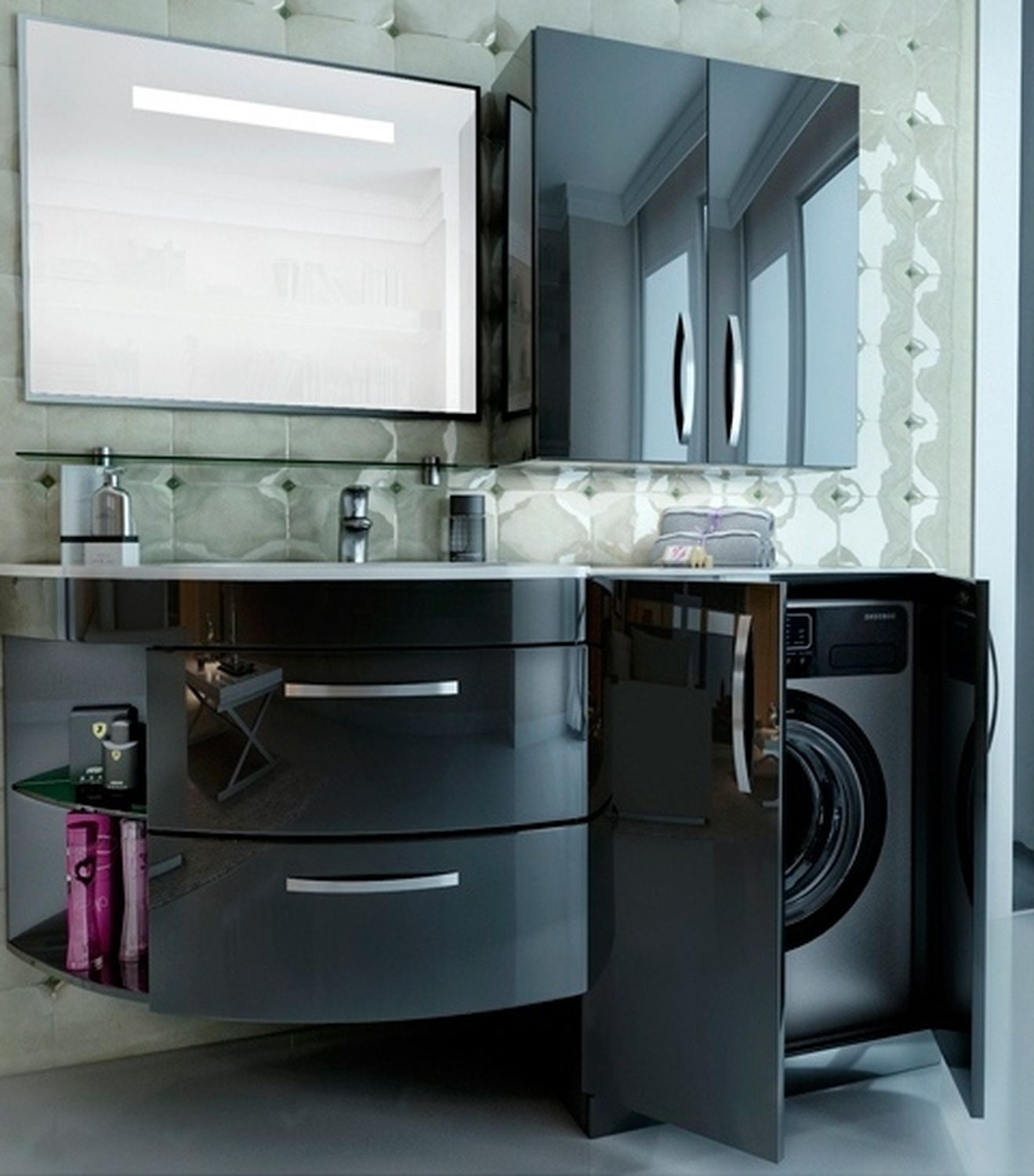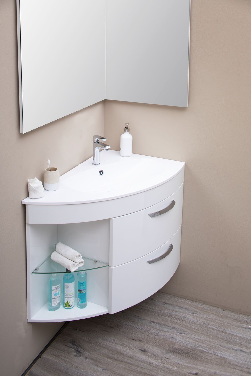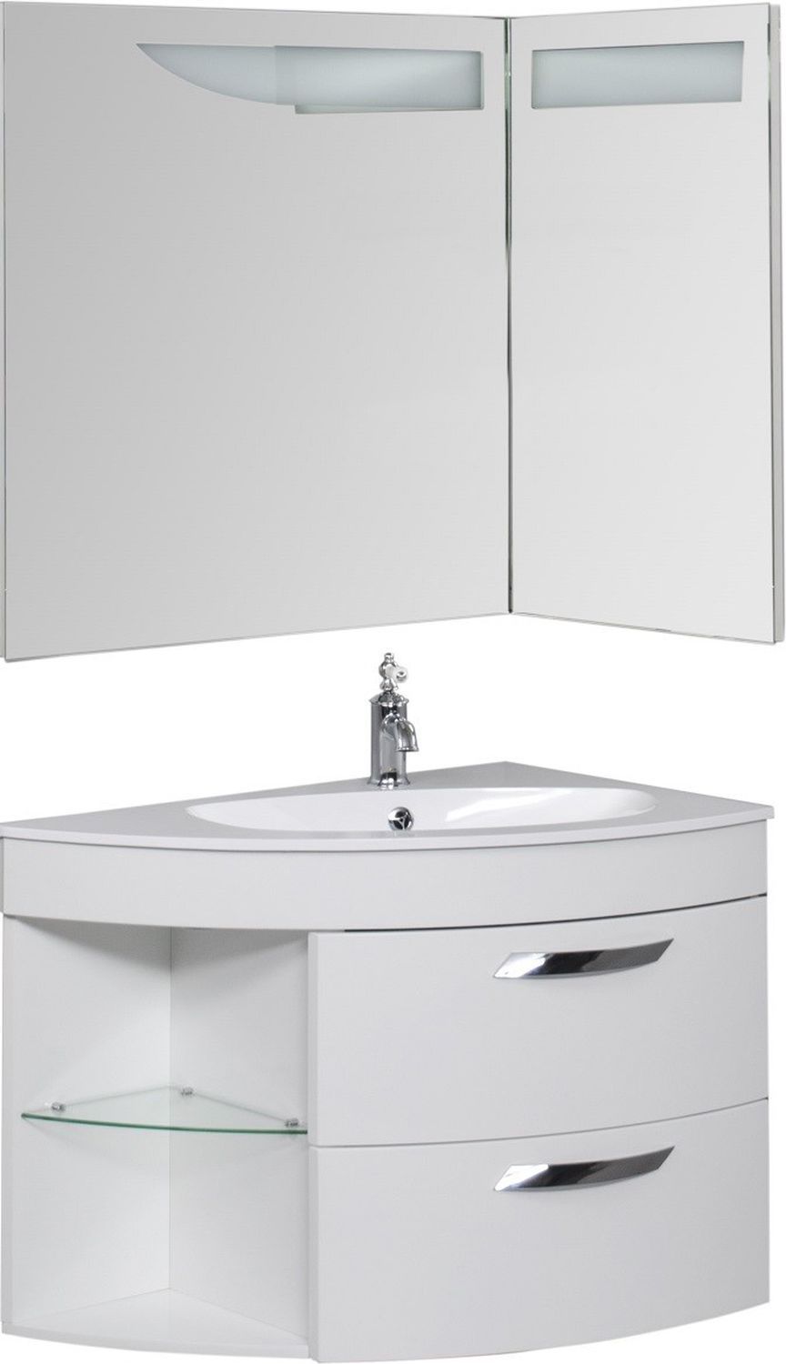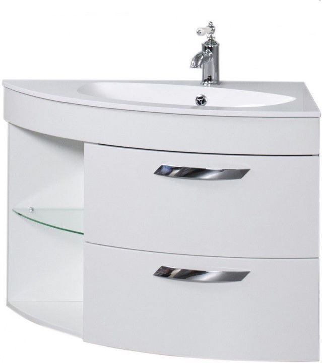 Аккуратная прозрачная полка встроена в левой части, подойдет для размещения элементов декора. Это правосторонняя мебель, которая отличается ассиметричной формой. Корпус изготовлен из МДФ, покрытого белой глянцевой краской, которая обеспечивает устойчивость к влаге и не позволяет стенкам разбухать.