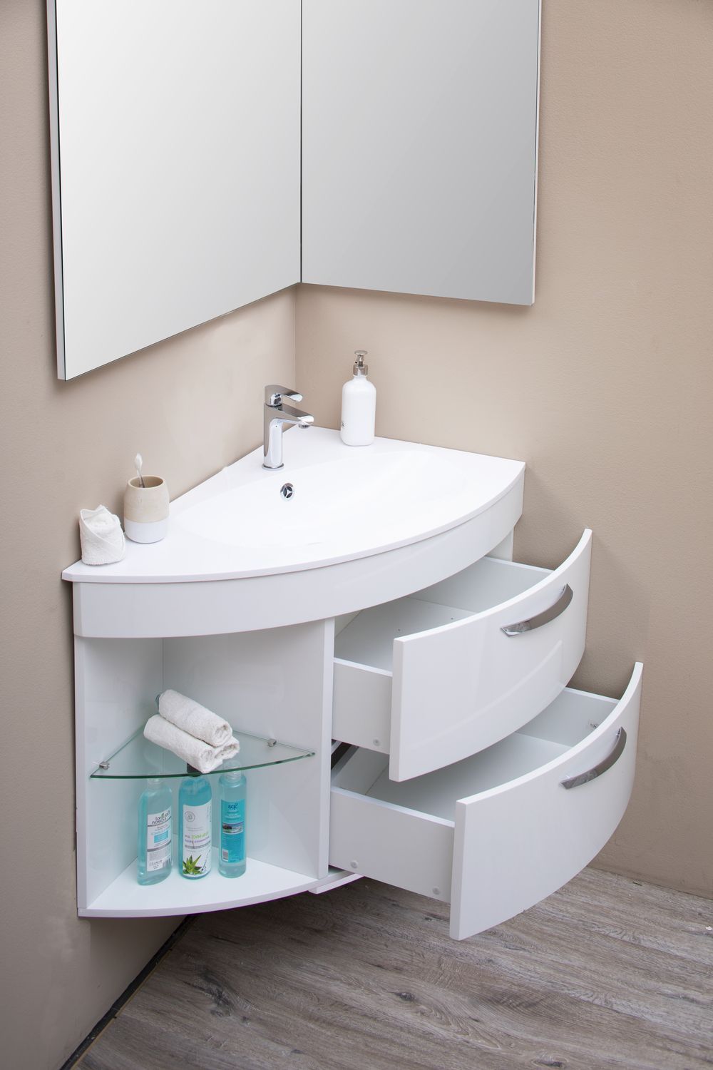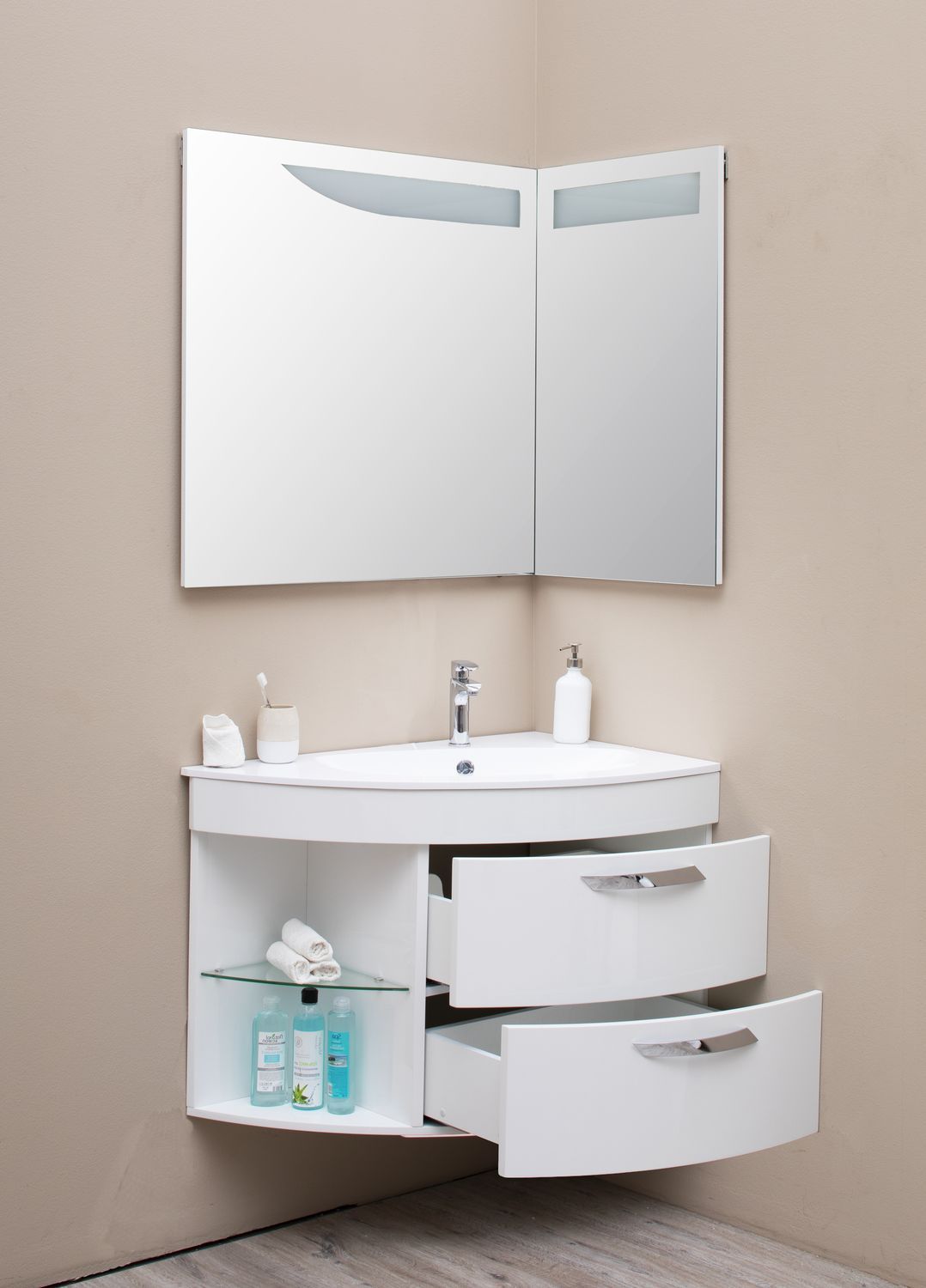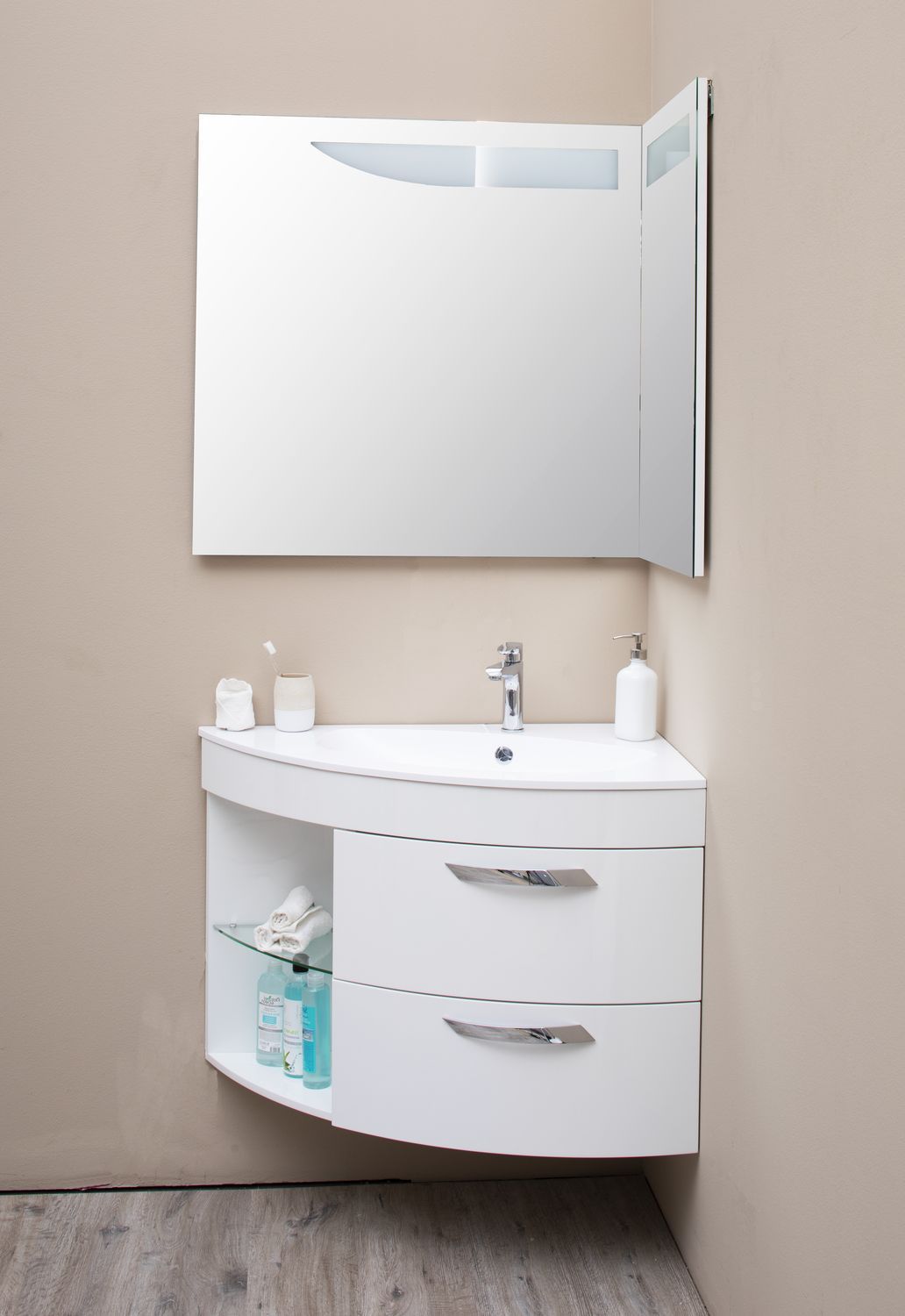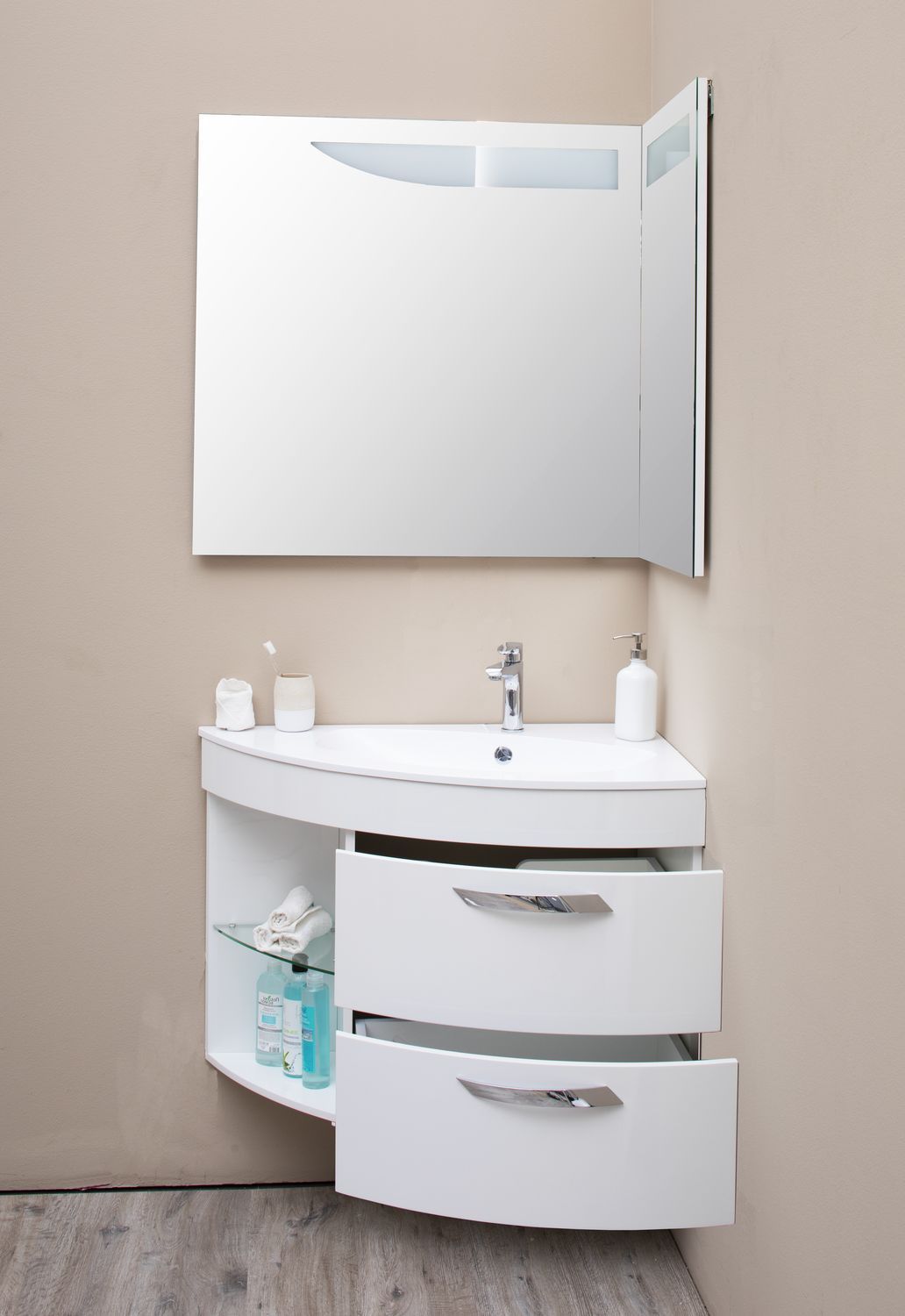 Тумба органично будет смотреться в комбинации с угловым зеркалом (артикул 184504), навесным шкафом (артикул 00185075).