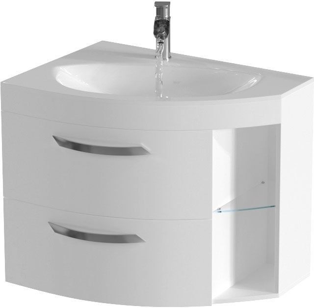 В качестве материала изготовления использован МДФ. Покрытие выполнено из глянцевой краски белого цвета, отличается устойчивостью к высокой влажности. Уход за поверхностью заключается в периодическом протирании мягкой тряпкой. Тумба ассиметричной формы подойдет для настенной установки в ванной, оформленной в классическом, скандинавском, минималистичном или современном стилях. Размеры — 780х535х640 мм.