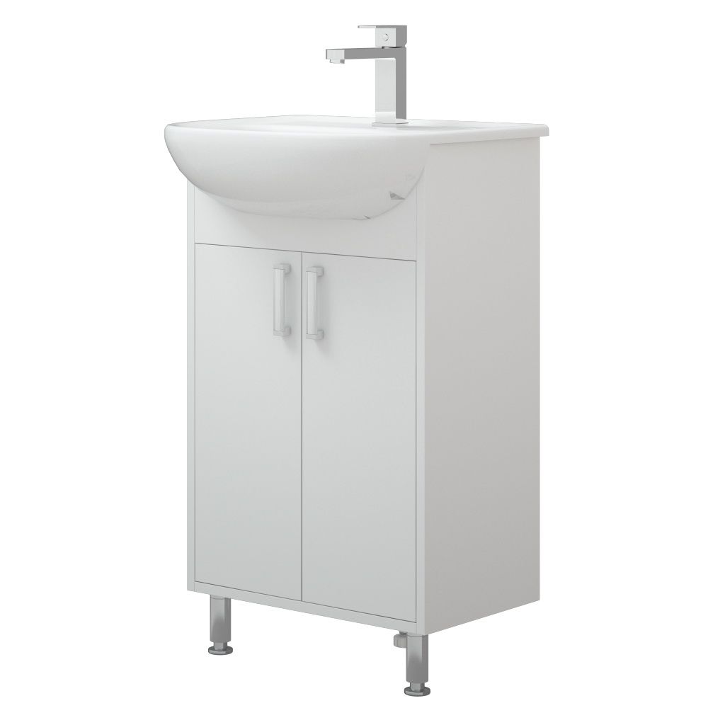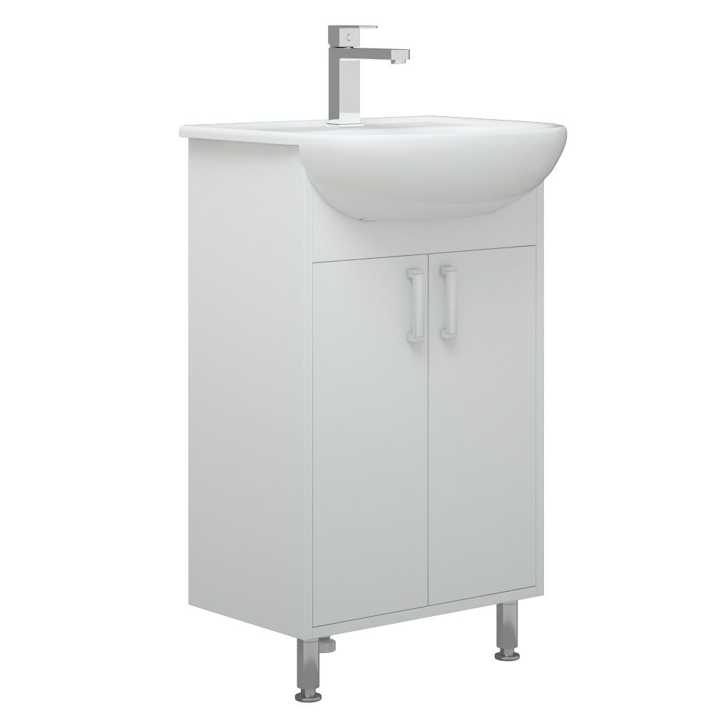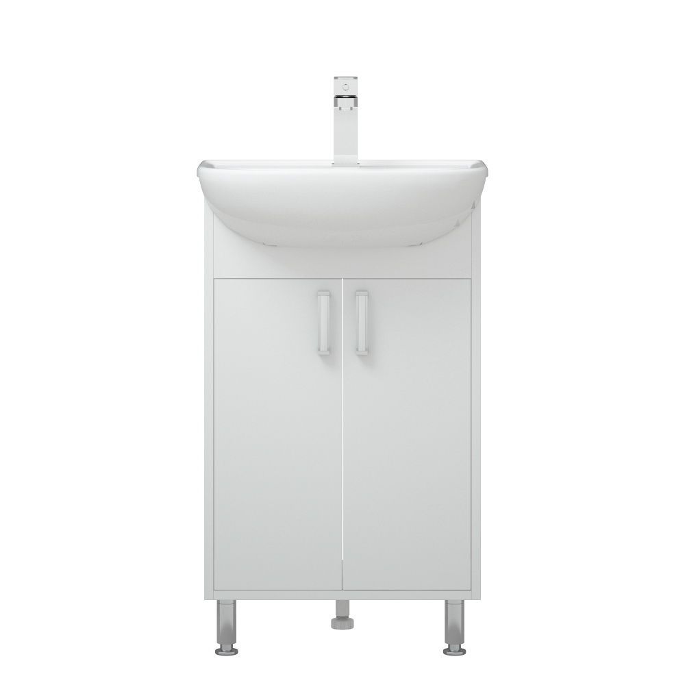 Тумба оснащена двумя распашными дверцами и одной полочкой за ними. У тумбы 2 мет. опоры спереди, сзади 1 пластиковая. Цветным элементом являются двери. Двери - крашенные матовой эмалью. Коромысло - МДФ в пленке.