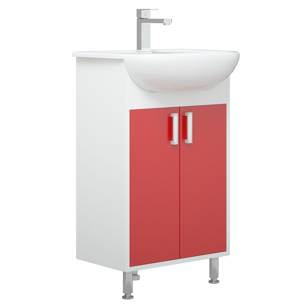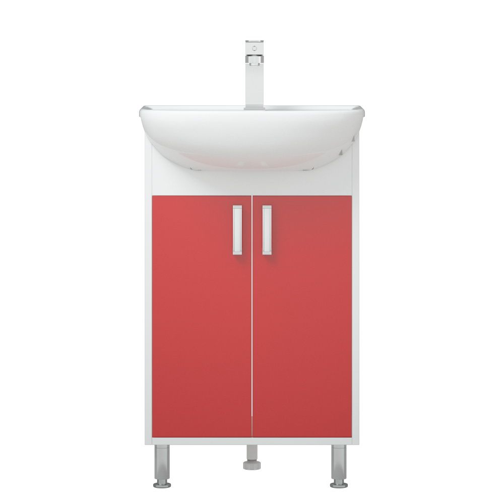 Тумба оснащена двумя распашными дверцами и одной полочкой за ними. У тумбы 2 мет. опоры спереди, сзади 1 пластиковая. Цветным элементом являются двери. Двери - крашенные матовой эмалью. Коромысло - МДФ в пленке.
