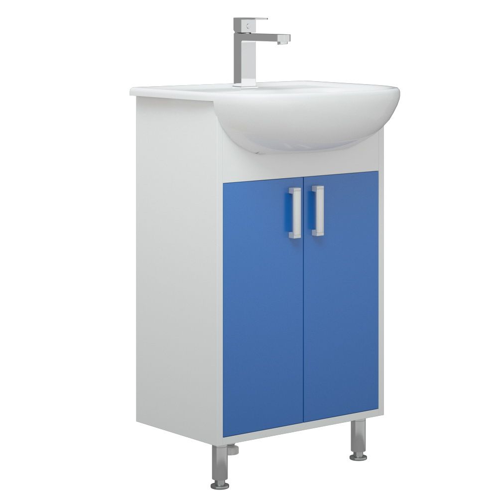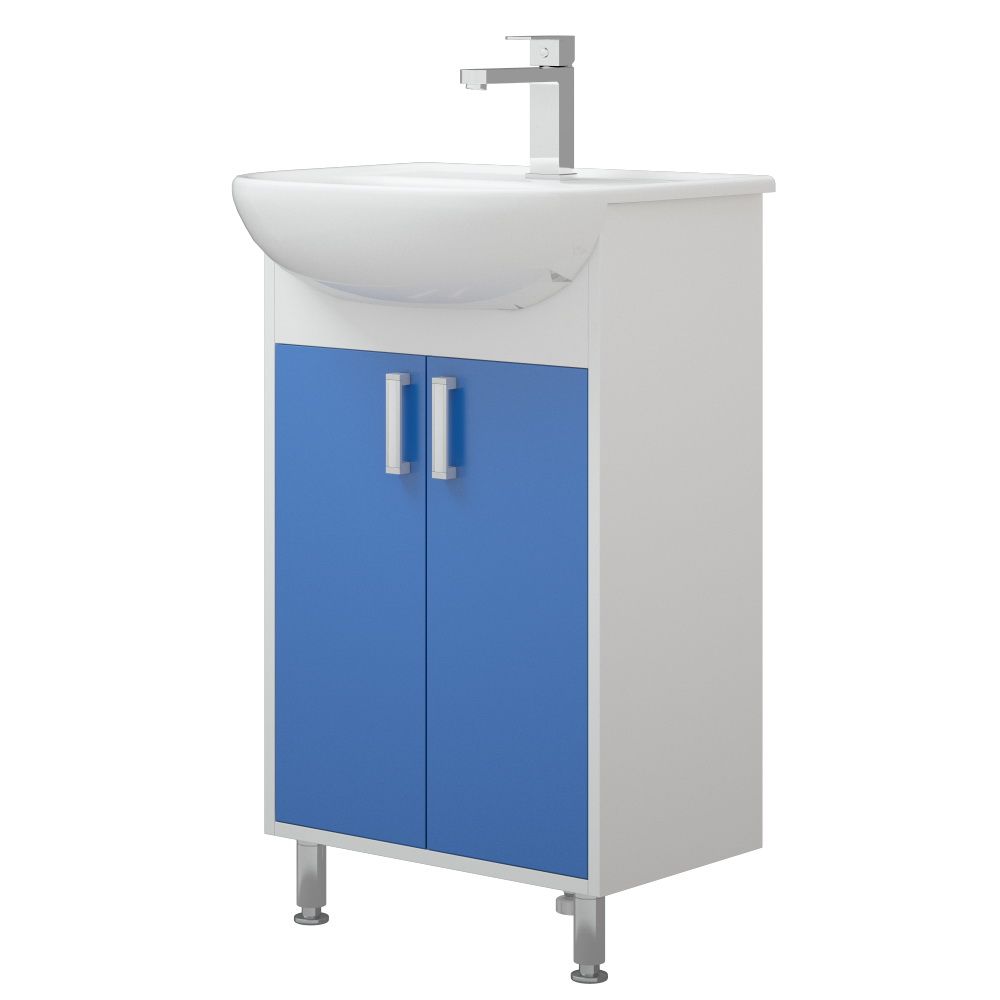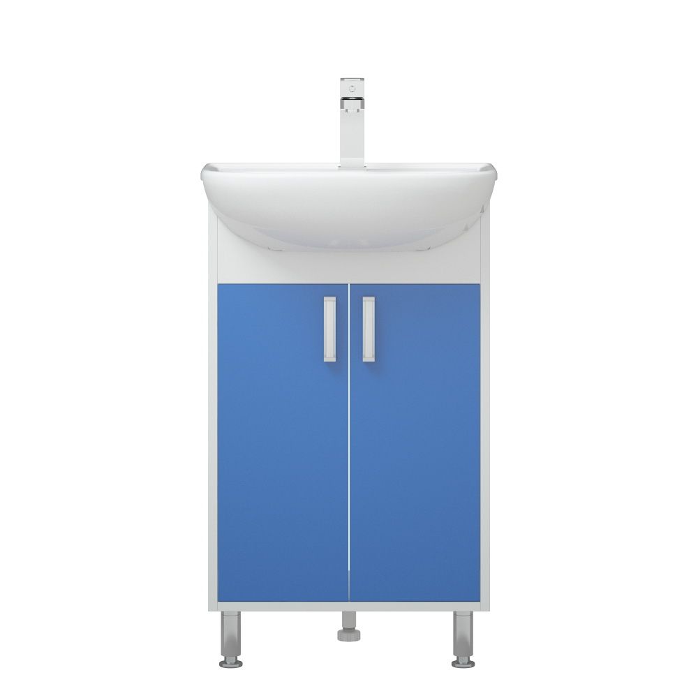 Тумба оснащена двумя распашными дверцами и одной полочкой за ними. У тумбы 2 мет. опоры спереди, сзади 1 пластиковая. Цветным элементом являются двери. Двери - крашенные матовой эмалью. Коромысло - МДФ в пленке.