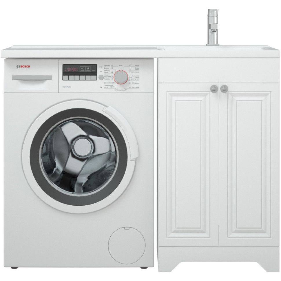 У тумбы "Леон 50" 2 распашные дверки. За дверками находятся полочки. Тумба предназначена под накладную раковину 1100 мм и стоит рядом со стиральной машиной. Петли на двери с доводчиками. Коромысло, дверь, фасады ящиков, цоколь - МДФ в плёнке белой, корпус - ЛДСП.