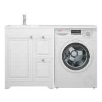 У тумбы слева большая дверь, справа 2 выдвижных ящика. Ящики на направляющих шариковых, высота ящиков 150 мм. Тумба предназначена под накладную раковину 1300 мм и стоит рядом со стиральной машиной. Петли на двери с доводчиками. Коромысло, дверь, фасады ящиков, цоколь - МДФ в плёнке ПВХ белой, корпус - ЛДСП.